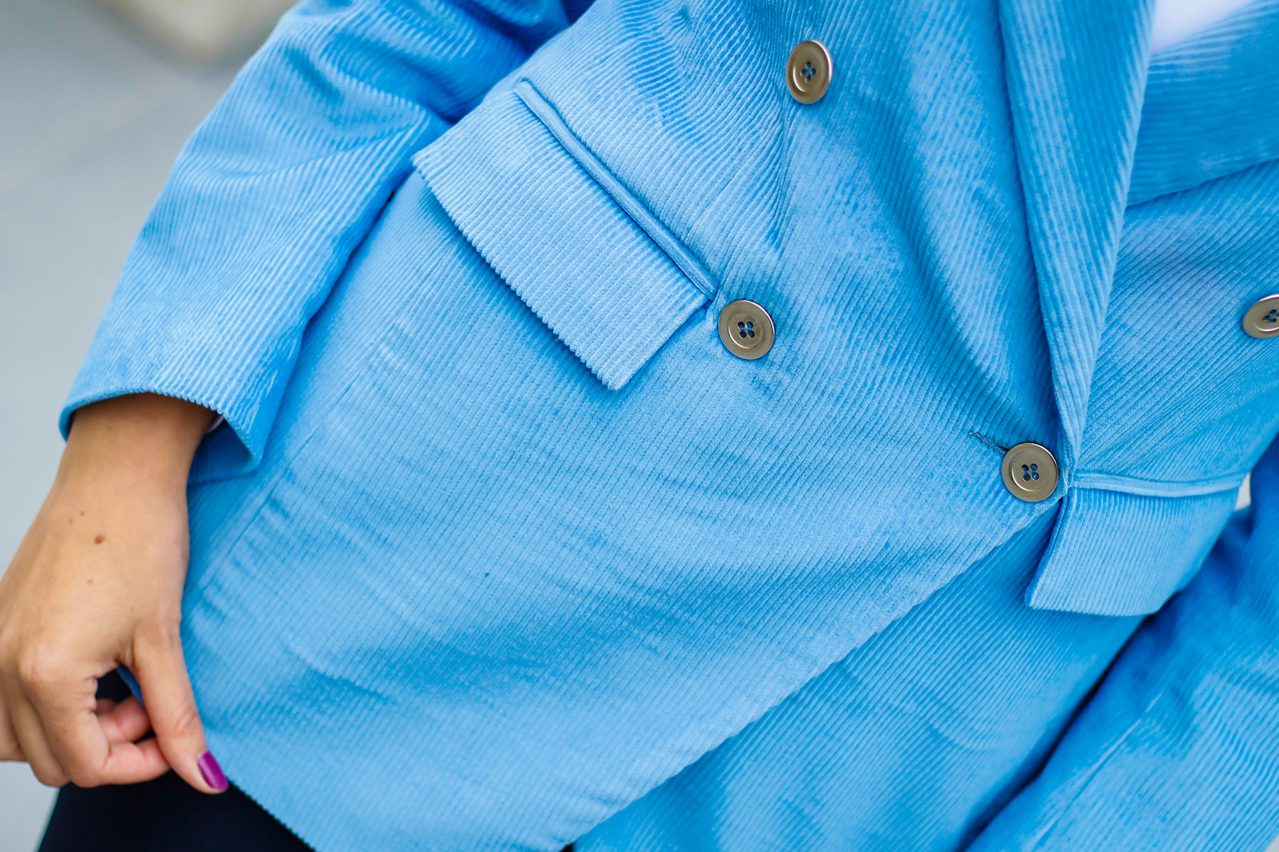 Blazer cruzado tipo saco en cotelé. Largos ideales para pantalones. Propuesta cómoda y estilosa para altas ejecutivas que deben distinguir en su empresa.